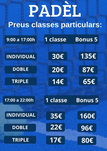 Oferim classes de pàdel per a totes les edats i nivells, des d’iniciació fins a competició. Els nostres entrenadors adapten les sessions per millorar la tècnica, la tàctica i la condició física en un ambient professional i motivador.